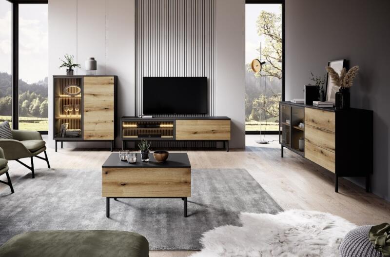 Élő fal TONG | LED világítással A TONG nappali fal a natúr tölgyfát elegáns fekete színnel ötvözi, melyet meleg LED-es világítás és színezett üveg mögött elhelyezett lécek egészítenek ki, melyek kellemes aurát keltenek. A hagyományos fogantyúkat modern push-to-open rendszerre cserélték a kényelmes nyitás érdekében, fogantyúk nélkül. A nappali fal azok számára készült, akik értékelik az eredeti dizájnt és az egyedi stílust. MDF lapok ABS él edzett üveg Élő fal TONG | LED világítással első osztályú anyagból készült és tartós ABS szalaggal van szegélyezve . A színezett edzett üveg a fekete kerettel és a LED világítással kombinálva modern megjelenést kölcsönöz a bútornak. A fiókok golyós vezetőkkel vannak felszerelve a könnyű nyitás és a teljes kihúzás érdekében. A magas fa lábak ideálisak robotporszívóval való használatra. A tisztítás egyszerű – csak törölje le egy nedves ruhával, vagy használjon bútorokhoz tervezett terméket. SZxMxM komód 150 2D3S: 149,9 x 84,8 x 39,4 cm SZxMxM