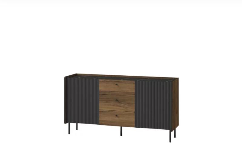 Komód ESPRITE P5 Az ESPRITE P5 komód modern dizájnnal készült, amely megjelenésével azonnal felkelti a figyelmet. Ez a hatás a gondosan kiválasztott színkombinációnak köszönhetően érhető el, beleértve a Warmia diót, a San Sebastiant és a matt feketét. A fiókok és ajtók kombinációja látványosabbá teszi. Elegendő helyet biztosít dokumentumok vagy egyéb dolgok tárolására . A 16 cm magas fekete fém lábak biztosítják a komód stabilitását és hosszú élettartamát. A komód oldalán ajtók találhatók, mögöttük polcok, a középső részben három fiók található. Ideális kiegészítője egy kisebb irodának vagy nappalinak. laminált lap 16 mm ABS élek barázdált   MDF fém lábak műanyag fogantyúk A bútorok tartós és könnyen karbantartható laminált lapból, valamint barázdált MDF-ből készülnek , amely elegáns és stílusos megjelenést kölcsönöz neki. Ez a darab a modern dizájnt praktikus anyagokkal ötvözi, ami garantálja a hosszú élettartamot és a könnyű gondozást. A tiszta megjelenés és a hosszú élettartam