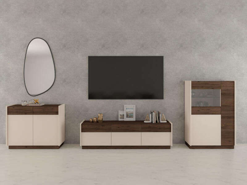 Az elegáns KOBE nappali fal három bútordarabból áll: komód 822, vitrin 002, TV asztal 301
